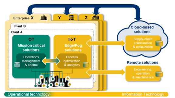怎樣把老一輩在工廠生產(chǎn)管理的經(jīng)驗(yàn)和積累的知識(shí), 通過數(shù)字化轉(zhuǎn)型成為“數(shù)字原生” 的知識(shí)財(cái)富, 并被年青一代繼承和發(fā)展,這一挑戰(zhàn)也可理解為 OT 與 IT 交匯融合,使得 OT 和 IT 各自的“神經(jīng)突觸”緊 緊相連, 從而為創(chuàng)造更多價(jià)值提供保證。圖5 是日本橫河利用工業(yè)互聯(lián)網(wǎng) IIoT 實(shí)現(xiàn)流程工業(yè)的 OT 和 IT 融合的解決方案。