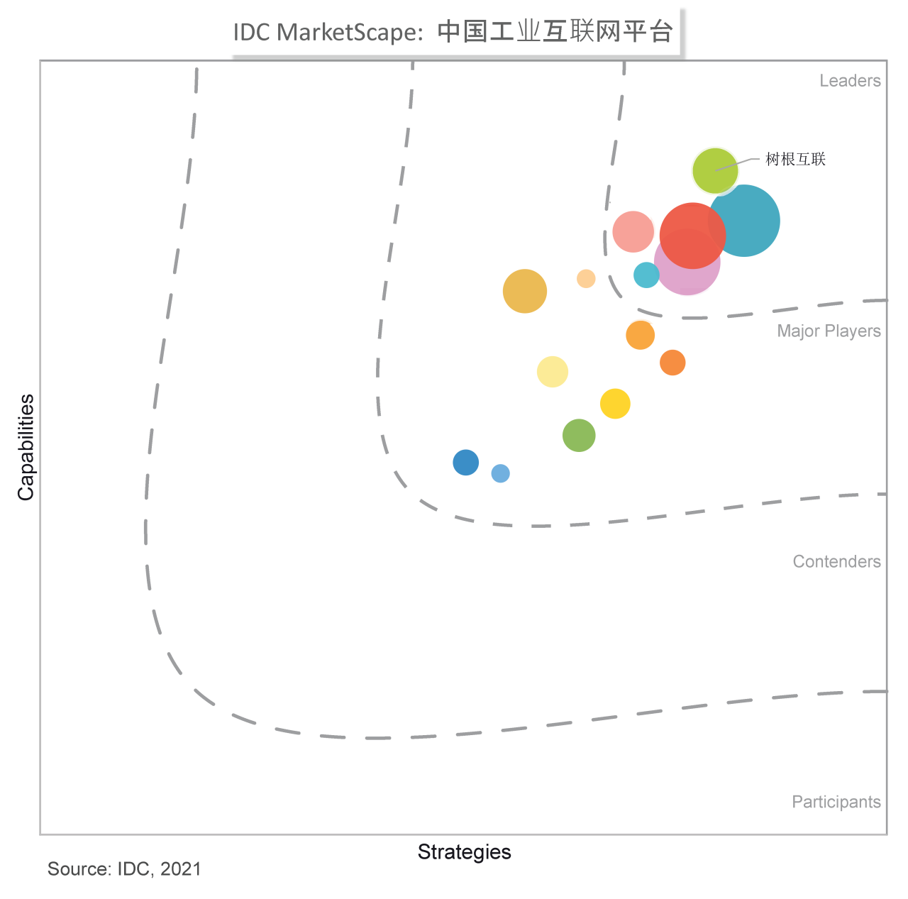 歷時(shí)半年,IDC調(diào)研了近30家相關(guān)廠商與近30家終端用戶,在全球IIoT平臺(tái)定義基礎(chǔ)上,將平臺(tái)產(chǎn)品及其解決方案共同納入本次研究范圍和評(píng)選標(biāo)準(zhǔn),從業(yè)務(wù)收入、產(chǎn)品功能、集團(tuán)業(yè)務(wù)占比等多個(gè)方向做了具體界定,從若干細(xì)分維度進(jìn)行評(píng)估,并分配不同的權(quán)重。 在IDC MarketScape圖中,縱軸是技術(shù)力,橫軸是戰(zhàn)略力,共有6家廠商位居Leaders區(qū)域。其中,樹(shù)根科技位于領(lǐng)導(dǎo)者象限,技術(shù)力居行業(yè)領(lǐng)先地位。 據(jù)IDC報(bào)告中的信息顯示,樹(shù)根科技的根云平臺(tái)其優(yōu)勢(shì)為市場(chǎng)認(rèn)知度高、設(shè)備接入能力強(qiáng)、持續(xù)經(jīng)營(yíng)能力相對(duì)較好,以及裝備后市場(chǎng)服務(wù)領(lǐng)域積累豐富。具體情況為: