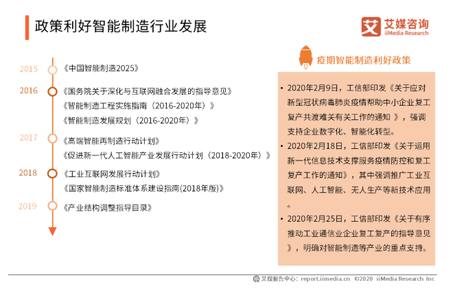隨著人口紅利消失制造業(yè)成本上升,國家近年發(fā)布多項政策支持制造業(yè)智能化轉(zhuǎn)型。疫情期間,國家也接連印發(fā)相關(guān)文件明確了對智能制造等重點產(chǎn)業(yè)的支持。艾媒咨詢分析師認為,智能制造在疫情期間曝光度增加,其表現(xiàn)也受到各界認可,相關(guān)鼓勵發(fā)展政策出臺也為行業(yè)進一步發(fā)展提供契機。
