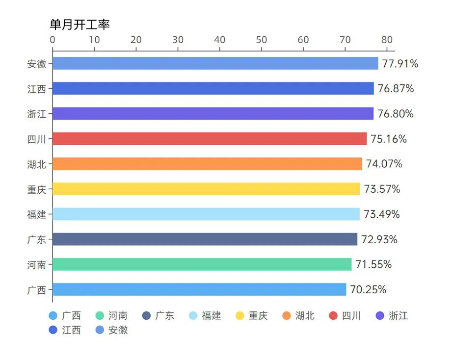 2月份,31個省份單月開工率超過去年同期水平,22個省份單月開工率超過60%,10個省份單月開工率更是超過70%。