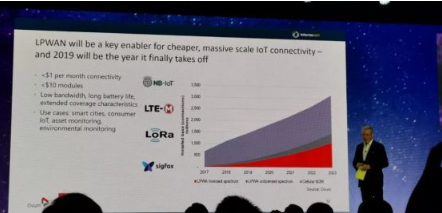在今天的大會上,Bell 認為LPWAN將是更廉價更巨大IoT 爆發(fā)的關鍵,2019年這個市場一定會起飛,今年每月連接費用降低到1美元以下,模塊成本降低到10美元以下(這個顯然還有點保守)。