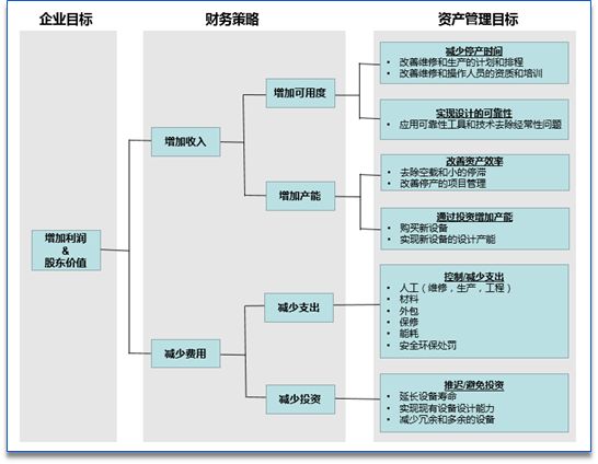可以看出企業增加利潤源于兩個方面,即增加收入和減少費用。增加收入源于增加設備可用度和產能,而減少費用則要減少運維成本和投資的資金成本。這就是管理企業全部設備資產、一類設備或一臺設備的原則。